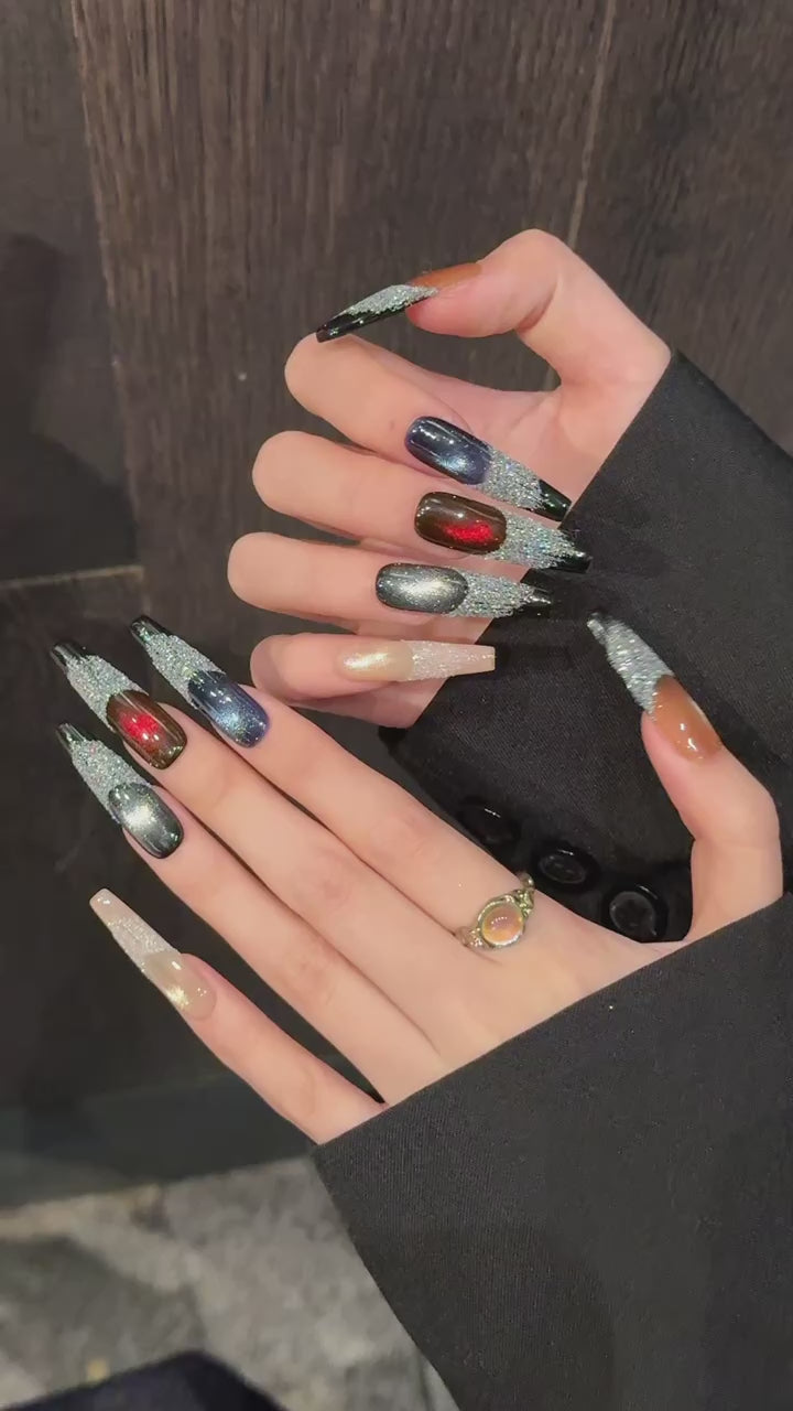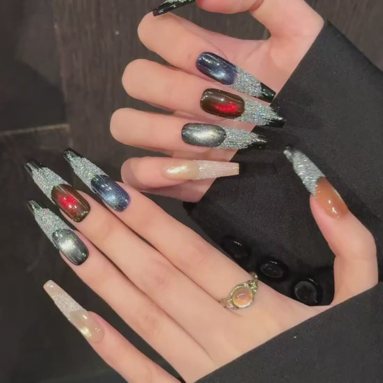 Multi - colored Sparkle Black - edge Fashion Press - on Nails