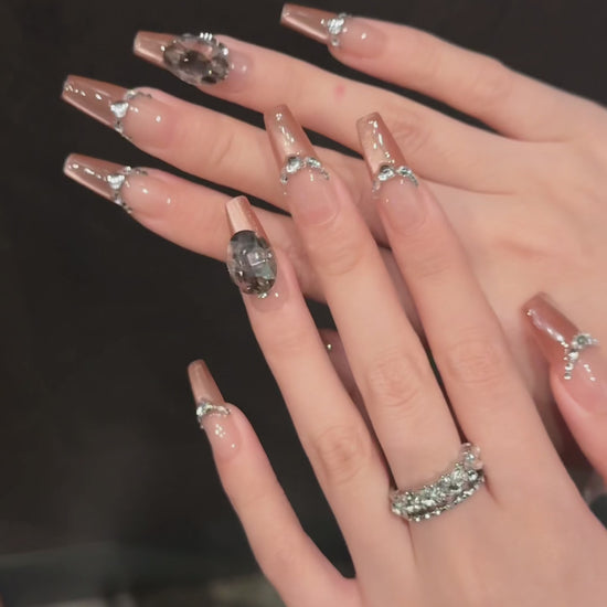 Nude - Pink Brown Gradient Gemstone Glam Press - on Nails