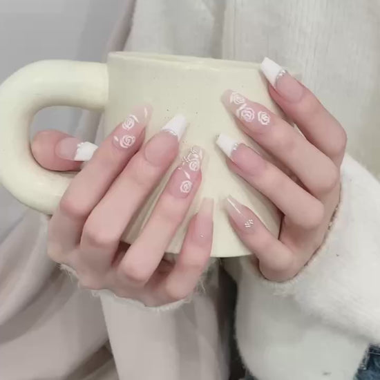 Nude - White Rose Sparkle Elegant Press - on Nails