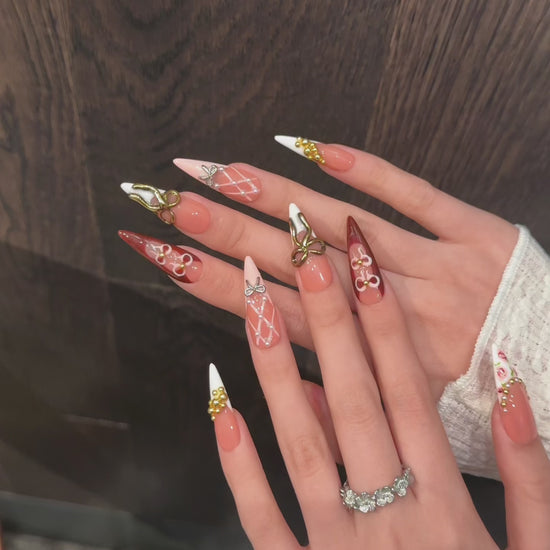Pink - White Gold Bow Pearl Rose Elegant Press - on Nails